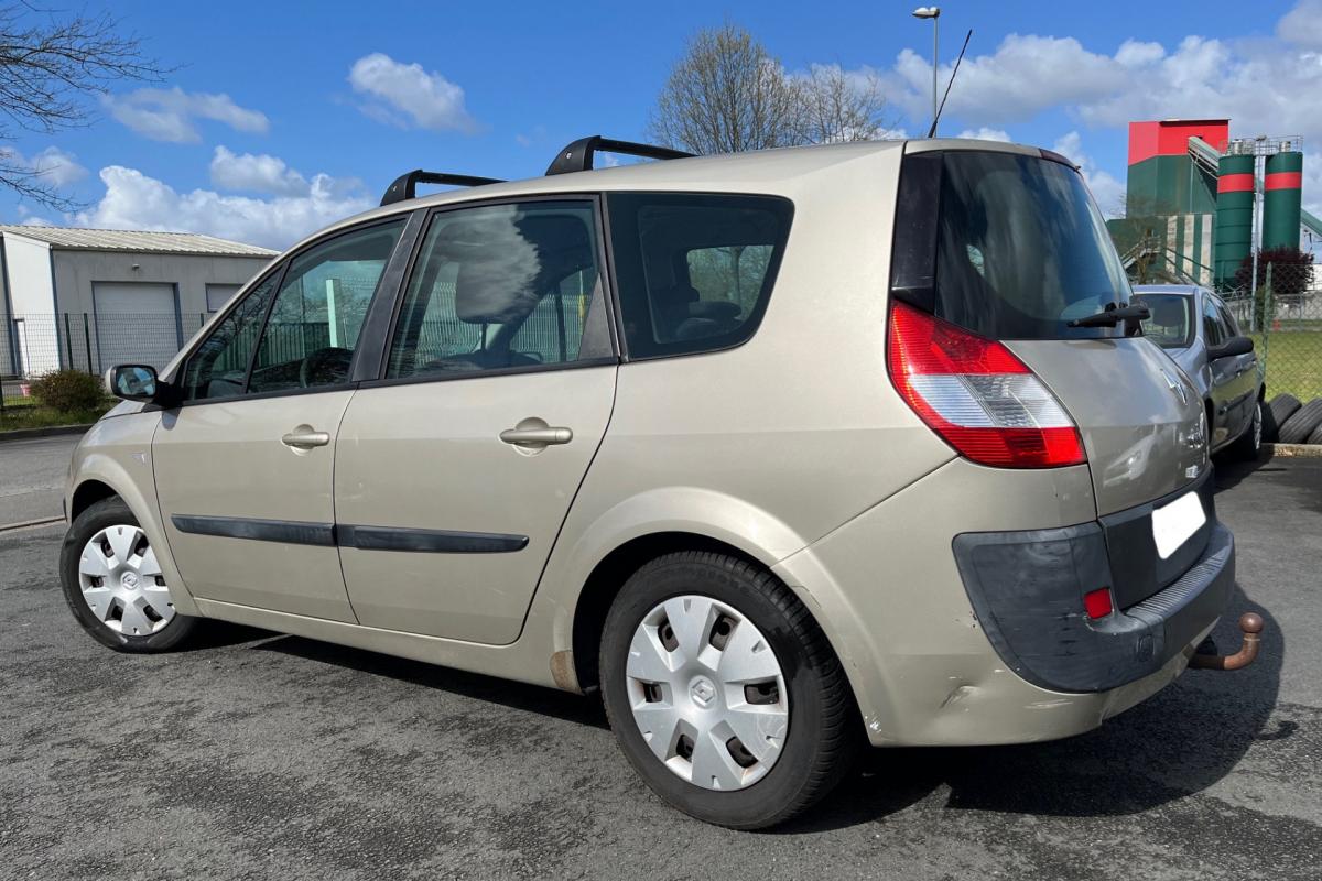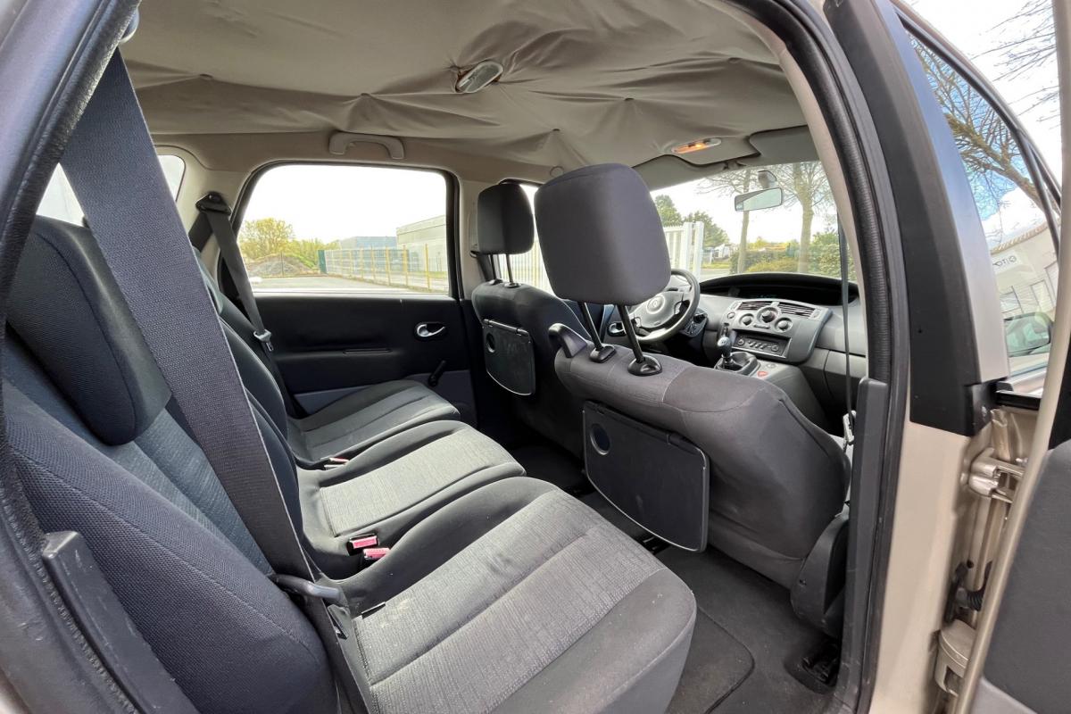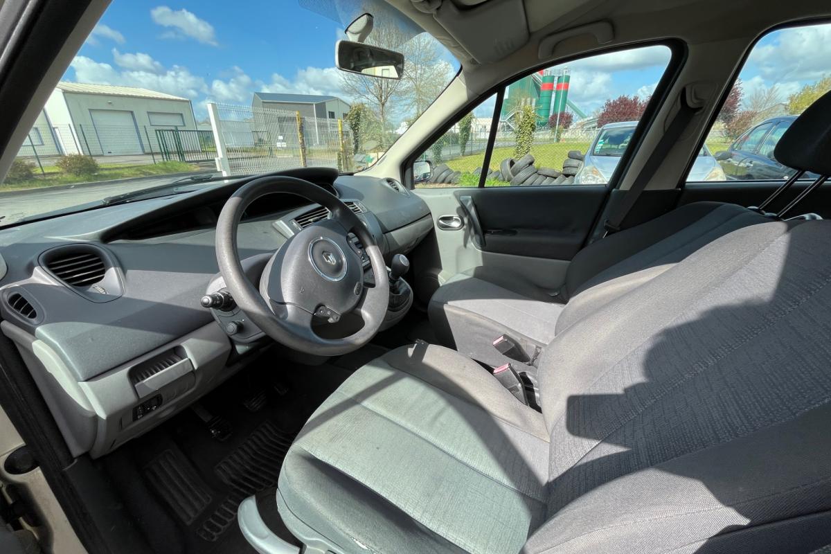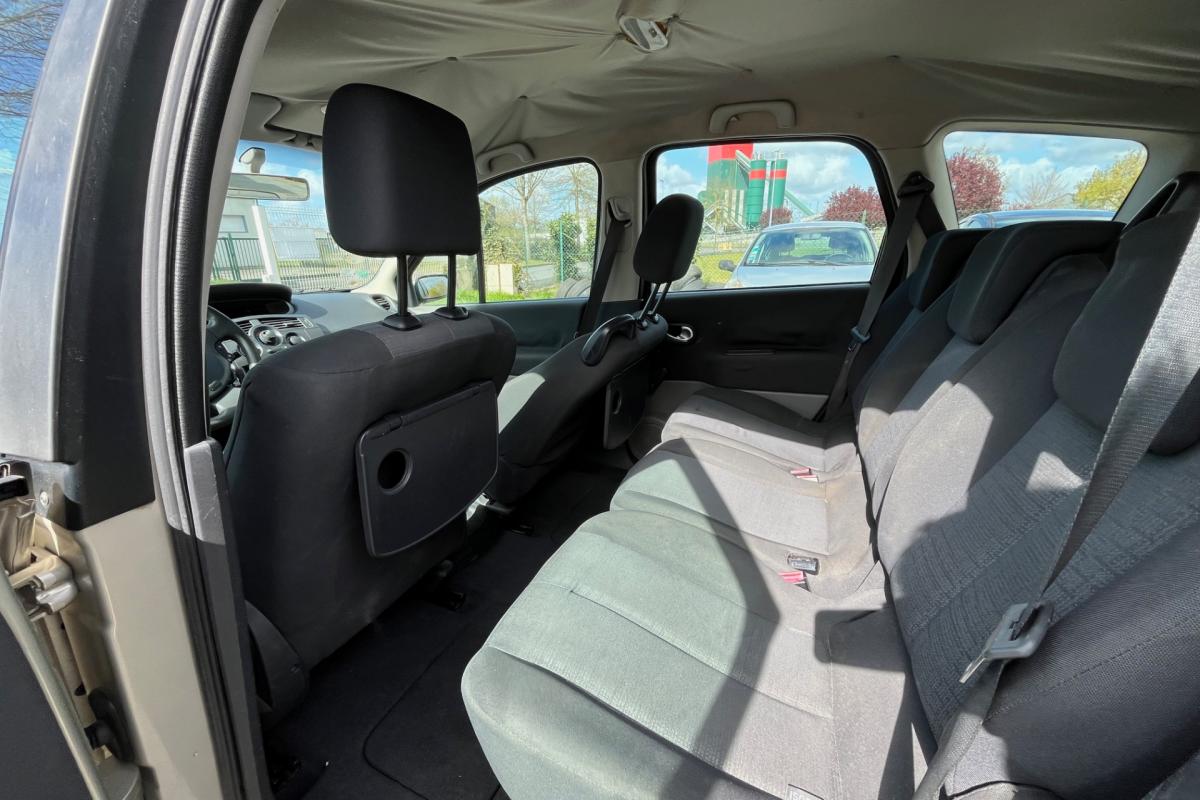 3 appui-tete type "virgule" sur sieges AR, 3 sieges de 2eme rangee, individuels, amovibles, avec dossier inclinable et rabattable, ABS avec repartiteur de freinage et assistance au freinage d'urgence, Affichage centrale : heure et radio, Airbags frontaux conducteur et passager adapatifs, Airbags frontaux conducteur et passager adapatifs (deconnectable), Airbags lateraux thorax adaptatifs conducteur et passager (deconnectable), Airbags rideaux, Allumage automatique des feux de detresse, Allumage automatique des feux de detresse en cas de freinage d'urgence, Allumage et extinction progressifs de l'eclairage interieur commandes par la carte Renault, Antenne courte de pavillon, Anti-demarrage electronique code active par transpondeur, Appuis-tete AR "Virgule" reglables en hauteur, Appuis-tete AV a protection rapprochee, Appuis-tete AV reglables en hauteur, Bacs de porte integrant porte-bouteille AV et porte-canette AR, Boite a gants de 17 litres eclairee et refrigeree, Carte Renault a telecommande, Ceintures de securite AR a 3 points (3eme rangee), Ceintures de securite aux places laterales de 2eme rangee 3 points avec pretensionneur et limiteur, Ceintures de securite AV 3 points, avec double pretensionneur et limiteur d'effort, Ceintures de securite centrale de 2eme rangee 3 points avec limiteur d'effort, Cendrier nomade, Climatisation manuelle avec filtre habitacle, Condamnation automatique des ouvrants en roulant, Condamnation centralisee des portes, de la trappe a carburant et ouverture a distance, Direction a assistance variable electrique, Eclairage d'accompagnement exterieur, Eclaireurs central AR, Emplacement porte-canettes sur console centrale AV, Essuie-vitre AR (mise en route automatique au passage de la marche AR), Essuie-vitre AV a 2 vitesses et a cadencement variable, Indicateur de temperature exterieure, Kit de regonflage, Leve-vitres AV electriques a impulsion, Ordinateur de bord 7 fonctions, Pare-soleil conducteur et passager avec miroir de courtoisie, Poignees de portes et retroviseurs ton caisse, Prise 12 V sur platine de levier de vitesse, Projecteurs a double optique, Radio 4x15W CD, RDS, code, avec satellite de commandes au volant, Radiosat 4x15W CD, Rangements fermes cote conducteur, Recyclage de l'air, Regulateur limiteur de vitesse, Retroviseurs exterieurs electriques degivrants, Siege conducteur reglable en hauteur, Sieges de 2eme rangee sur glissieres, Systeme de fixation ISOFIX pour sieges enfants aux places laterales AR 2eme rangee et passager AV, Systeme de fixation ISOFIX pour sieges enfants aux places laterales AR passager AV, Tablettes type aviation au dos des sieges AV, Tiroir sous siege AV, Trappe dans passage de roue AR gauche, Trappe de rangement sous pieds AV/AR, Vitres et pare-brise teintes, Volant 3 branches reglable en hauteur et profondeur,